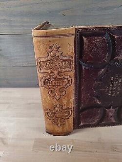 1872 Sainte Bible contenant l'Ancien et le Nouveau Testament selon la version autorisée ; avec les références marginales et les diverses lectures habituelles. Également, notes, réflexions, questions, lectures améliorées, divisions améliorées des chapitres, ordre chronologique, portions métriques distinguées, et divers autres avantages, sans perturber l'ordre habituel des livres, versets et chapitres. Illustrée de nombreuses gravures descriptives. Hartford : Imprimée et publiée par Case, Lockwood & Brainard. Reliure en cuir d'origine usée, mais solide.